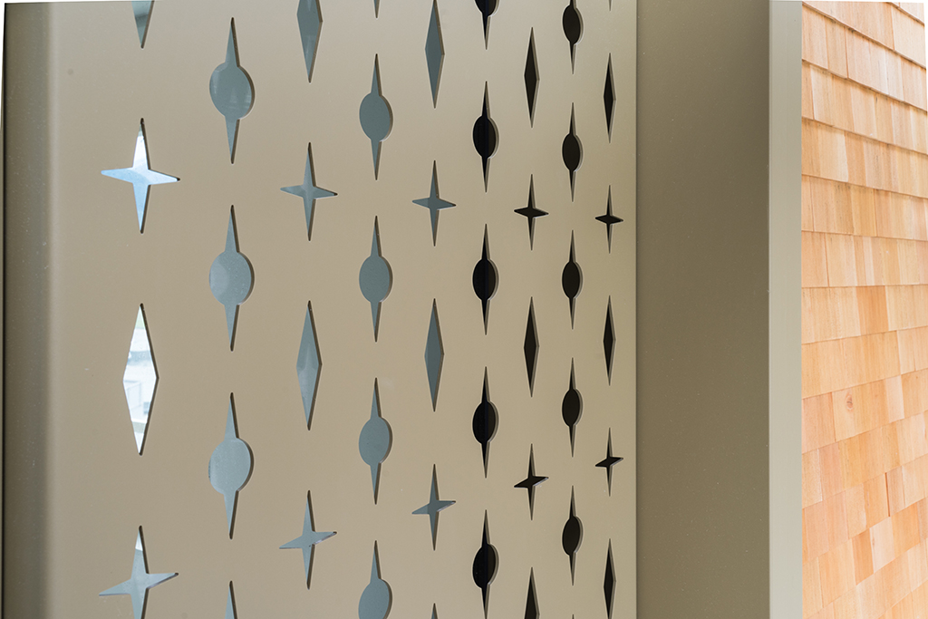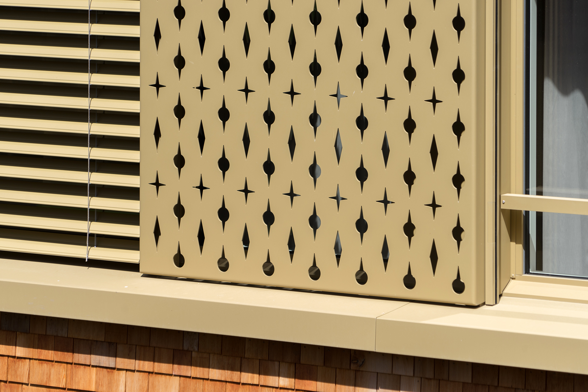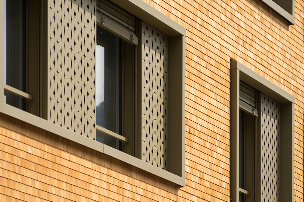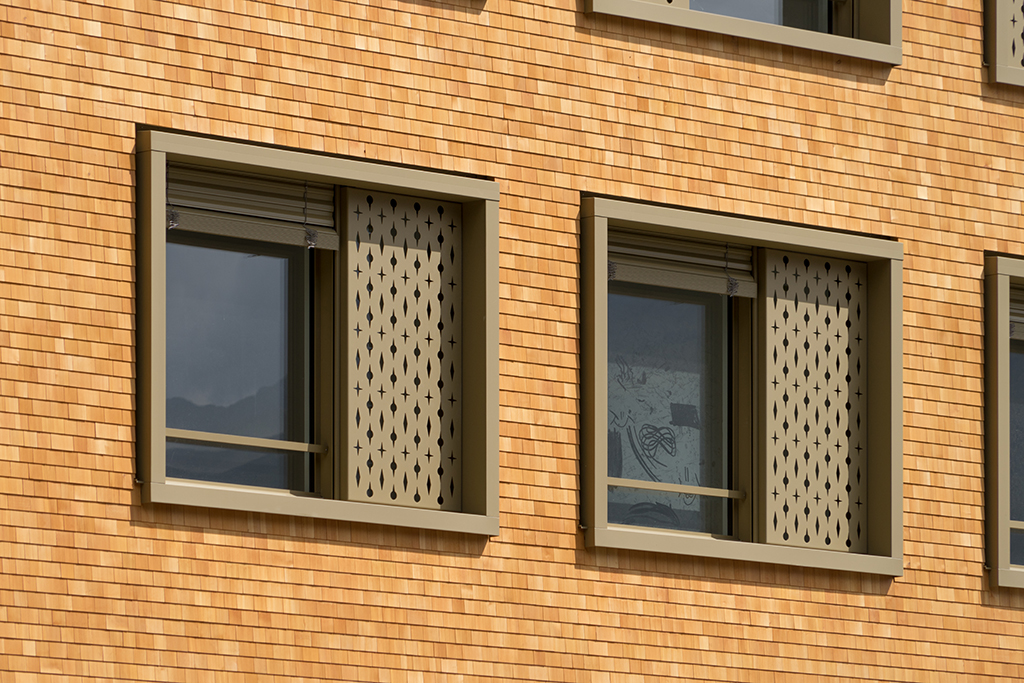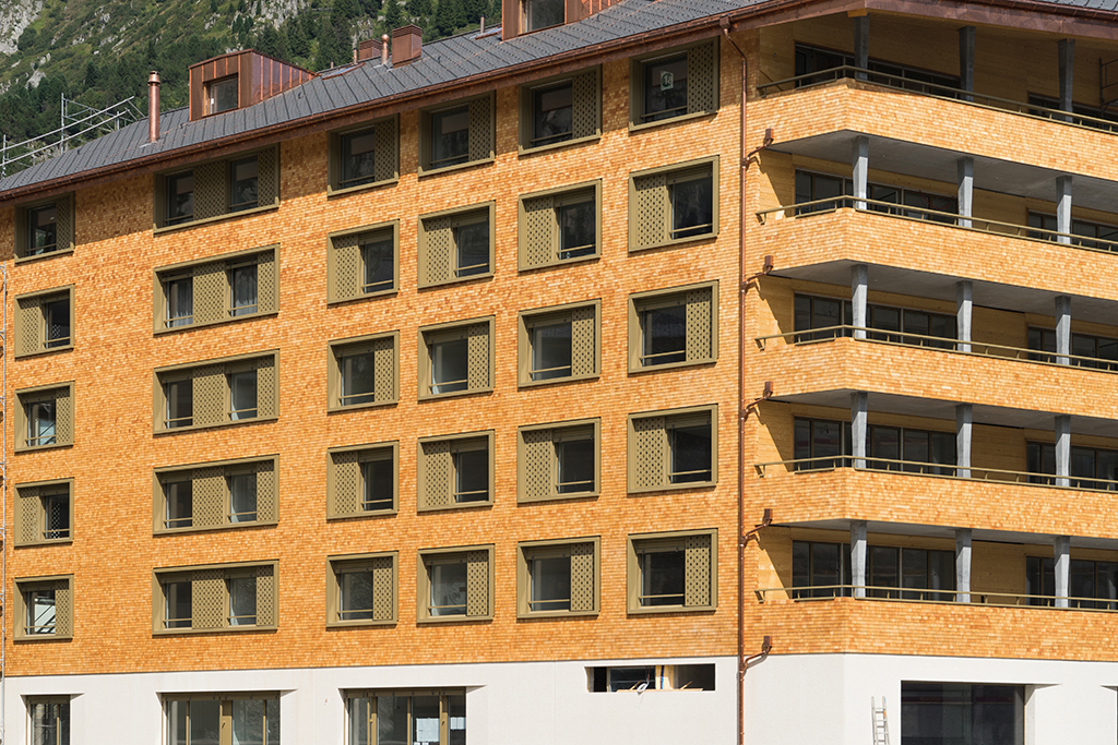 Der Gebäudekörper des Apartmenthaus Wolf in Andermatt ist dreiteilig gegliedert durch einen farbig lasierten Sockel aus Sichtbeton, die eigentliche Holzfassade der oberen Geschosse sowie durch das Steildach. In der naturbelassenen, hinterlüfteten Lärchenschindel-Fassade sind die die grossformatigen Holz-Metall Fenster mit einer Metallzarge platziert. Die Ornamente bringen eine wunderschöne Lichtstimmungen in das Gebäudeinnere.