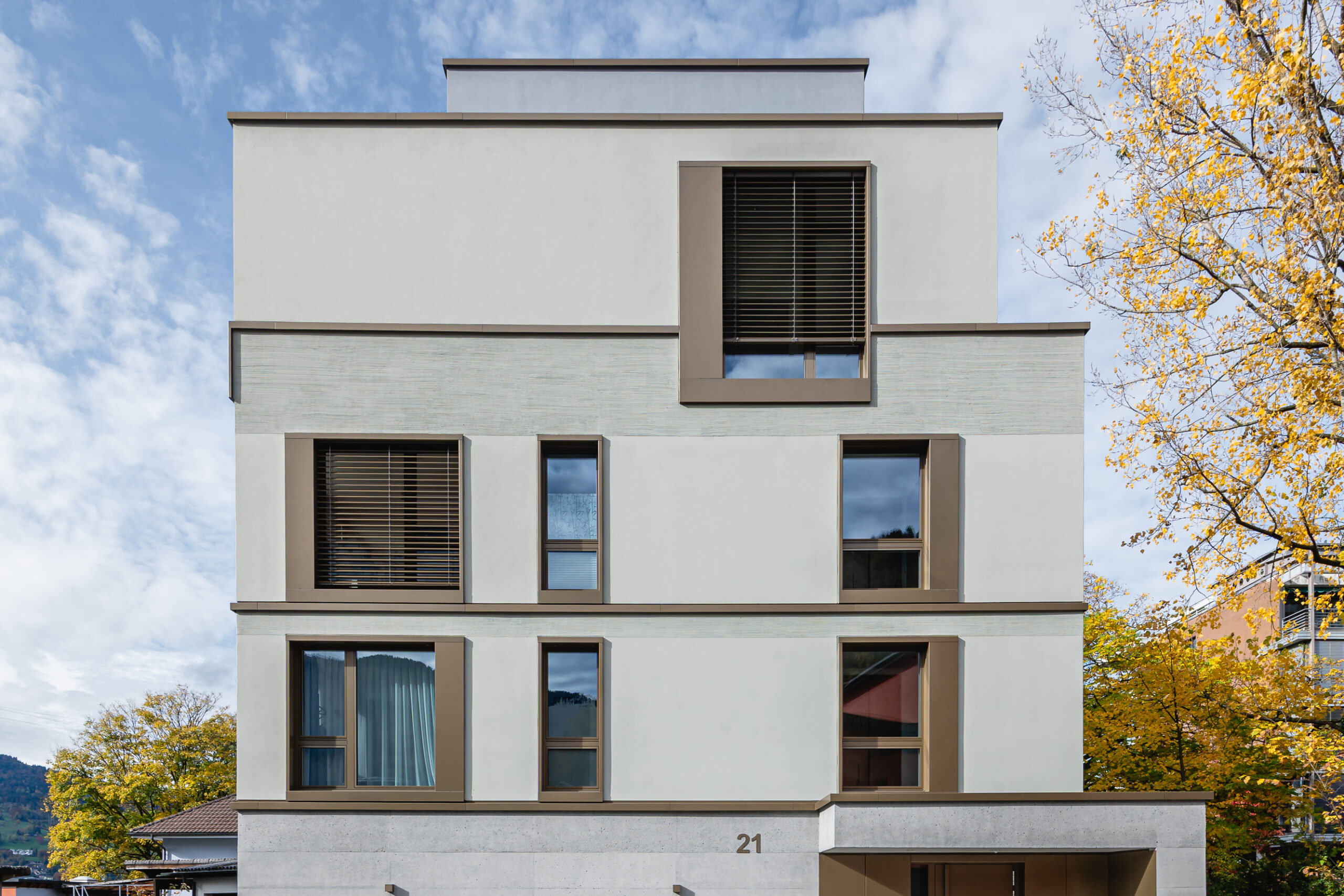 Das Mehrfamilienhaus an der Kehrsitenstrasse in Stansstad liegt nahe am Vierwaldstättersee. Die Ausrichtung der Wohnungen nutzt den Ausblick und prägt die Gestaltung. Die Fassade wirkt klar und hochwertig, getragen von sorgfältig ausgearbeiteten Details. Besonders prägend sind die Fensterzargen mit unterschiedlichen Spiegelbreiten. So entsteht ein stimmiges Spiel aus Proportionen, Tiefe und Licht, das dem Gebäude eine klare, nuancierte Fassadenwirkung gibt. Auch bei den Anschlüssen zeigt sich die Präzision in der Ausführung. Die Brüstungsabdeckungen sind mit gezielten Höhenversätzen umgesetzt und strukturieren die horizontale Linie der Fassade. Das Streifbanksystem Streba® greift diese Staffelung auf und fügt sich sauber in das Gesamtbild ein. Insgesamt entsteht ein stimmiger Ausdruck, der durch klare Linien und eine konsequente Detailführung überzeugt.