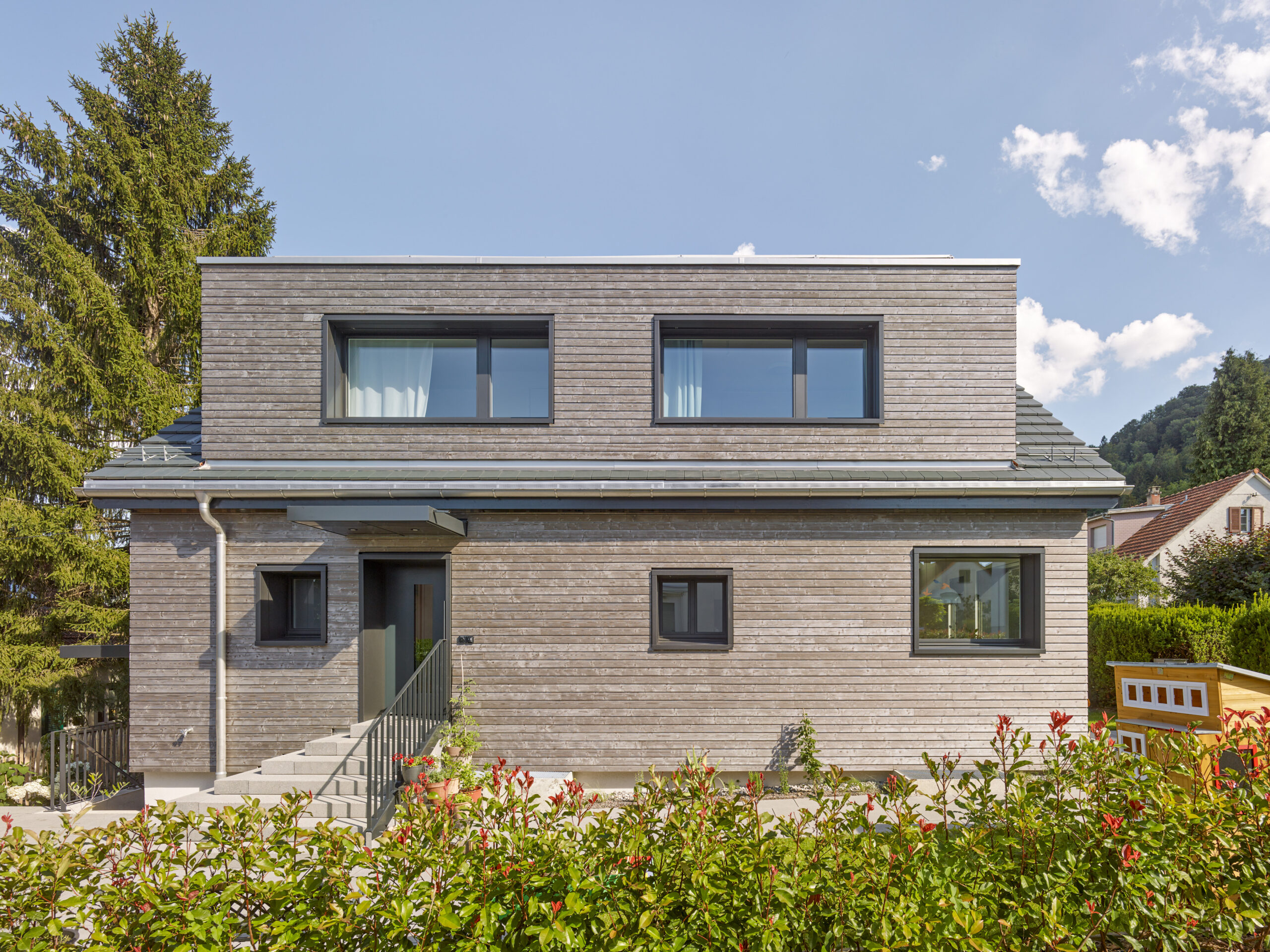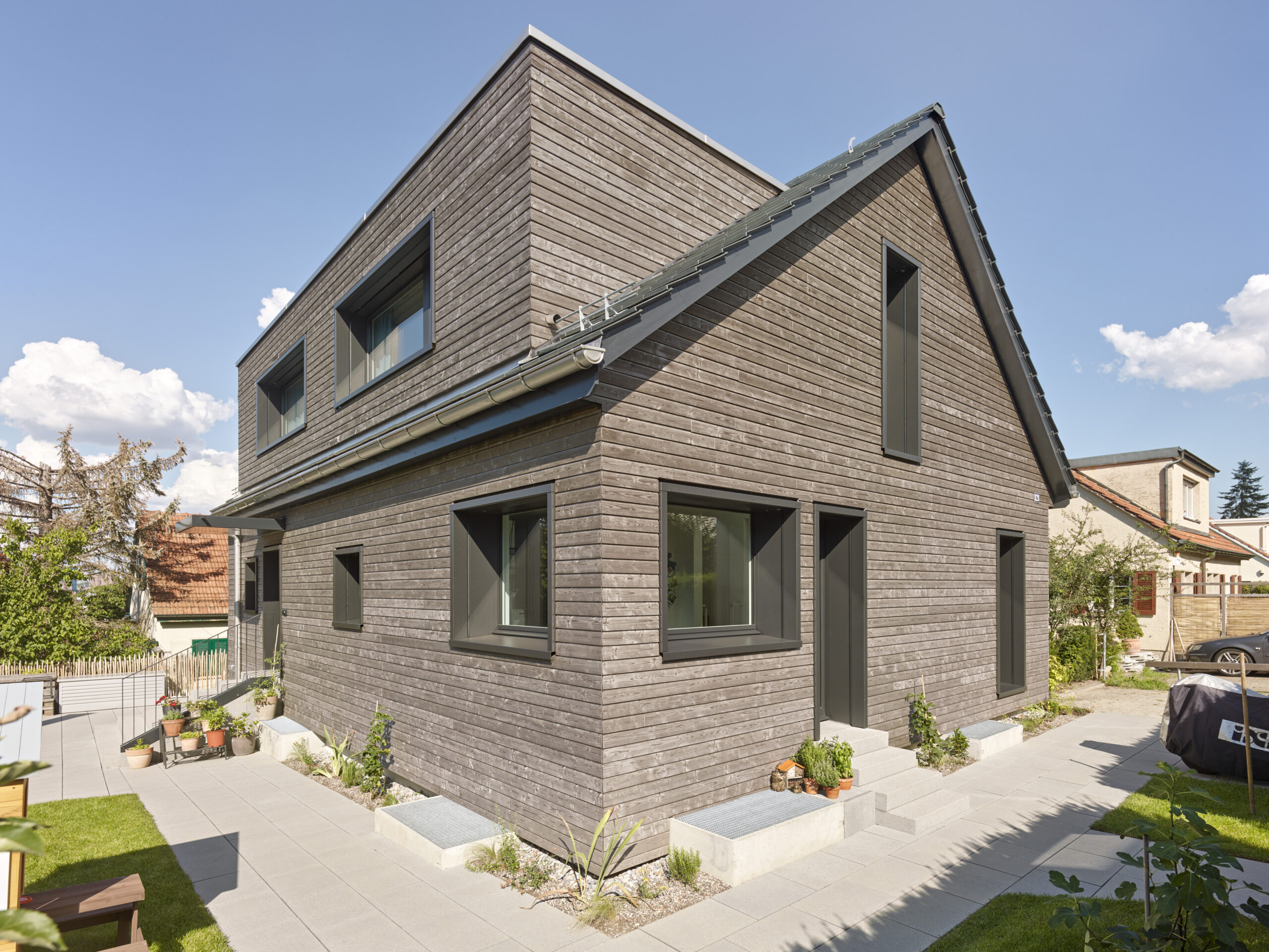 Das Einfamilienhaus wurde im Jahre 1933 als Teil der Gartensiedlung «Globus-Heimeli» errichtet. Charakteristisch für die neu erschlossenen Gebiete an der Peripherie von Zürich waren damals diese kleinen Einfamilienhäuser, die den finanziellen Möglichkeiten des unteren Mittel- standes und von Arbeiterfamilien entsprachen. Nun musste das Haus energetisch neu erschlossen und entsprechend komplett isoliert werden. Um ein einheitliches Erscheinungsbild zu gewährleisten und die Modernität des Hauses zu unterstreichen, haben sich die Architekten für eine Fassadenschalung in vorvergrauter Fichte entschieden. Die Fensterleibungen wurden mit Aluminiumfensterzargen bestückt.